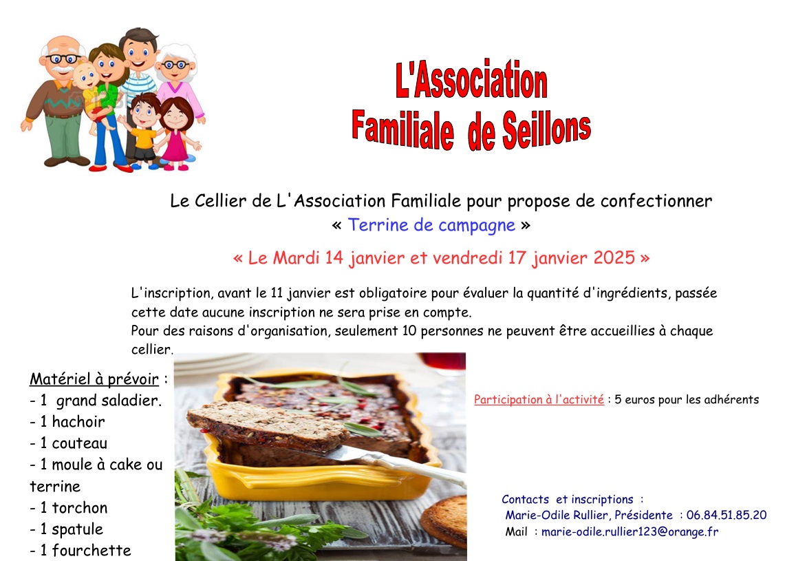 Inscription obligatoire avant le 11 janvier auprès de Marie-Odile, présidente de l’Association Familiale :