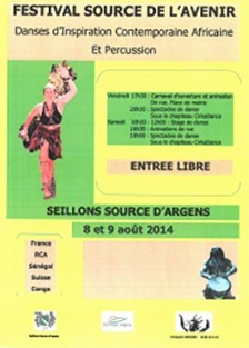 Le Week-end du 8 au 9 Août les rues de Seillons vont raisonner au son des percussions africaines. La compagnie Sarango organise le premier festival « Source de l’Avenir ». Ce festival de danses d’inspiration contemporaine africaine et de percussion sera l’occasion pour tous les seillonnais de découvrir et s’essayer aux rythmes africains.