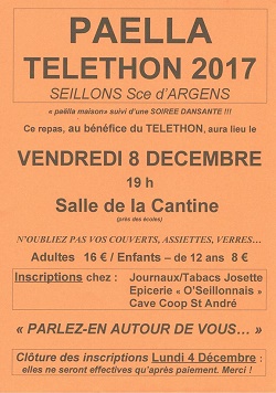 Le Téléthon 2017 débutera vendredi 8 décembre à Seillons. En attendant le programme complet des animations qui vous seront proposées, réservez dès à présent vos repas: