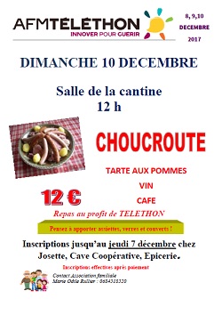 Menu Choucroute préparée par l’association familiale. Vous avez jusqu’au jeudi 7 décembre pour vous inscrire.
