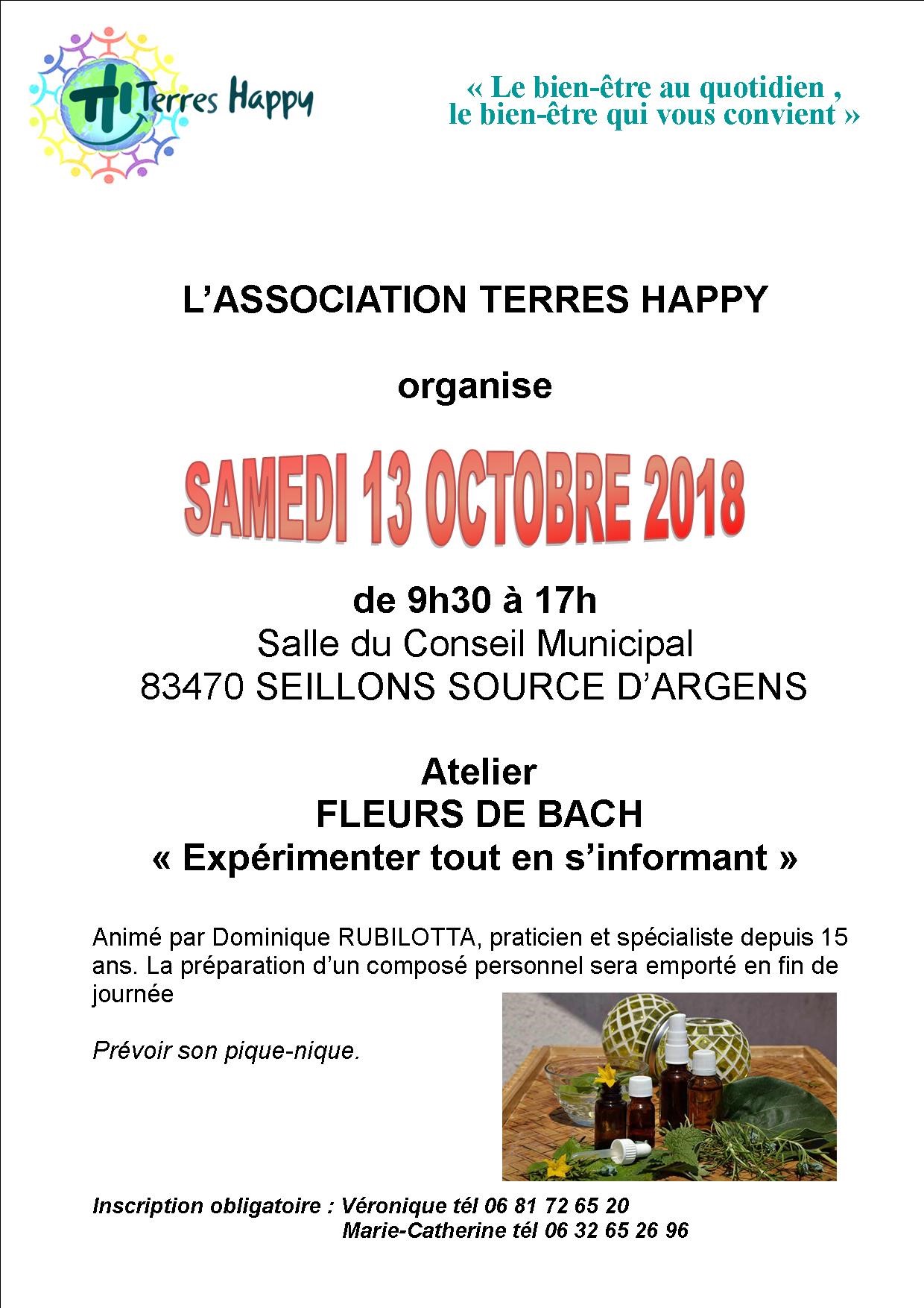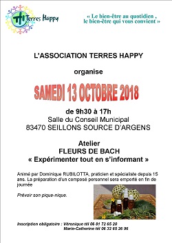L’association Terres Happy vous invite à un atelier découverte et expérimentation sur les « Fleurs de Bach ». Considérée comme une médecine douce et naturelle, l’utilisation des fleurs de Bach est un soutien pour retrouver équilibre et lutter contre les maux contemporains tel que: le stress, le manque de confiance en soi, l’anxiété, la fatigue, le chagrin…