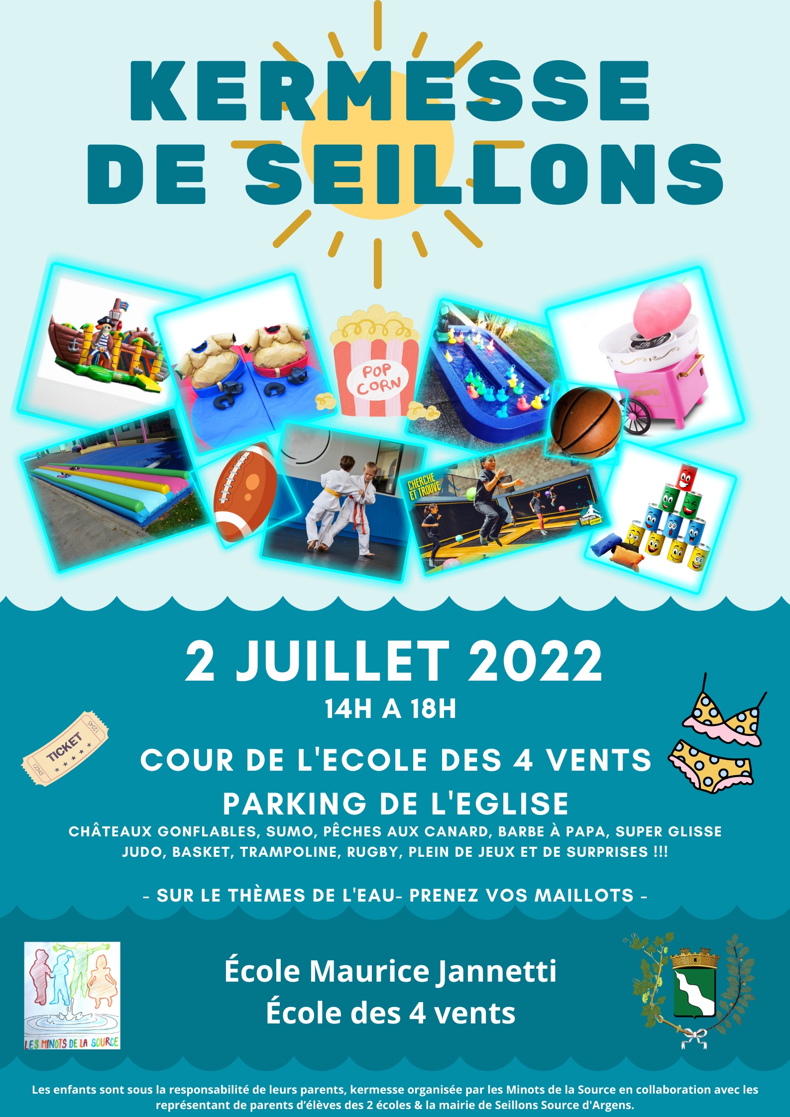 La fin de l’école arrive à grands pas, des parents d’élèves élus de l’école maternelle Maurice Janetti et de l’école élémentaire des 4 vents ainsi que l’association « les Minots de la Source » s’activent pour finaliser l’organisation de la Grande Kermesse 2022 des écoles, qui se déroulera le :