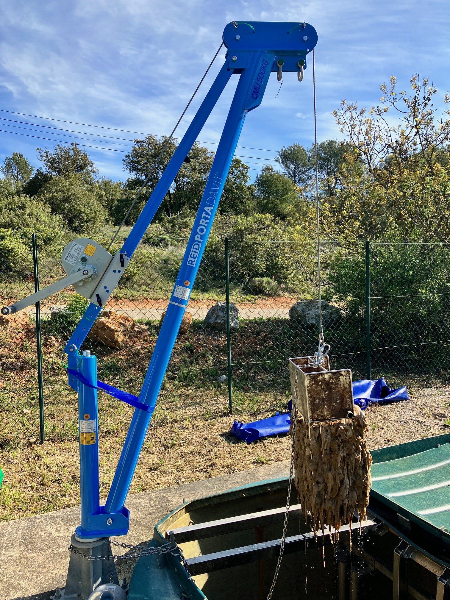 Les employés sont donc contraints de vider ces paniers deux fois par semaine. Un panier pèse environ 60kg lorsqu’il est rempli. Jusqu’à présent, cette opération était manuelle et à la seule force des bras. Pour faciliter et sécuriser le travail de nos équipes, une potence avec treuil (pour un montant de 3 878,40 €) est venue compléter les installations.