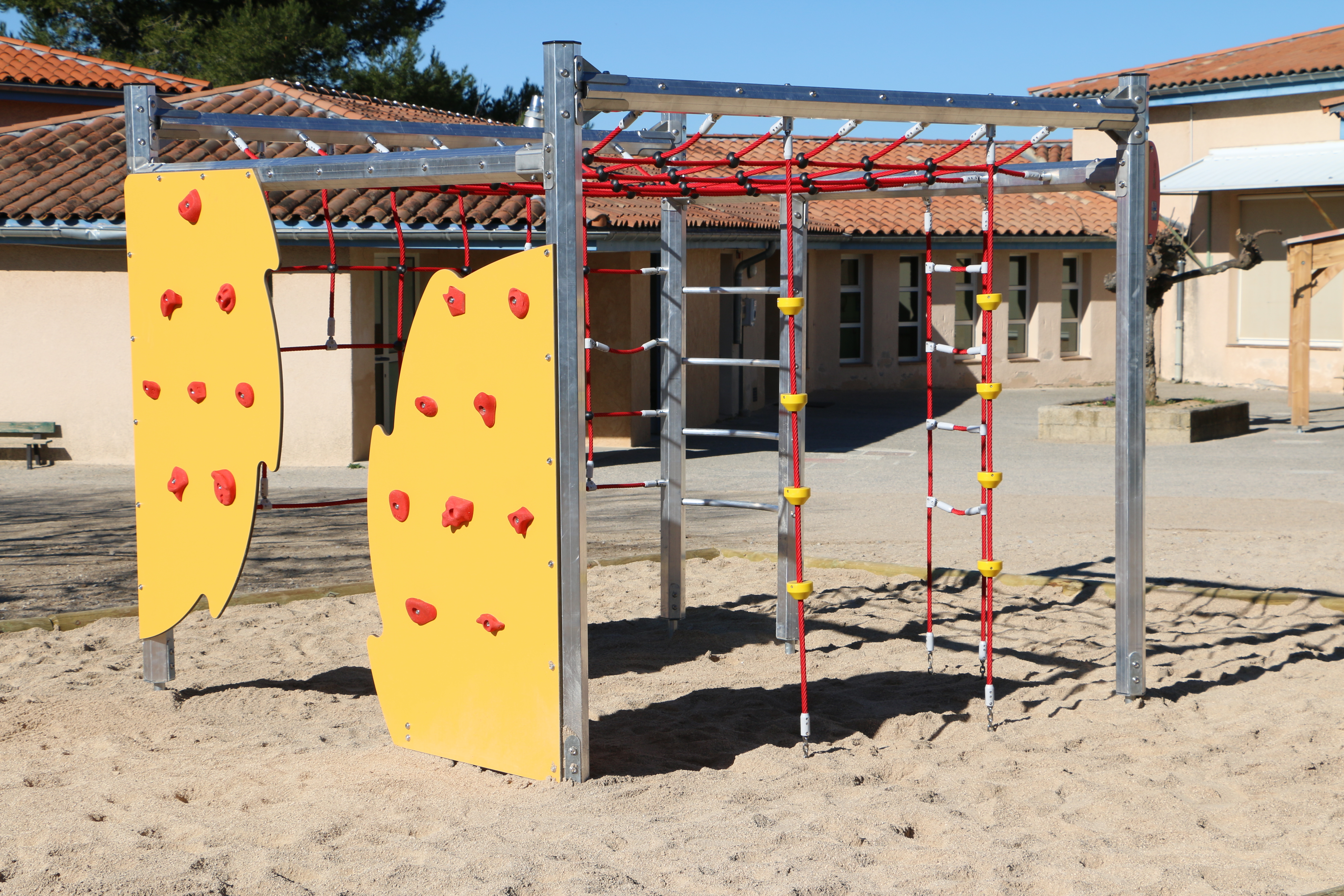 Les élèves pourront donc dès ce lundi de rentrée, retrouver un tourniquet tout neuf qui remplace l’ancien devenu trop vieux et découvrir une nouvelle et magnifique structure de grimpe et d’équilibre.