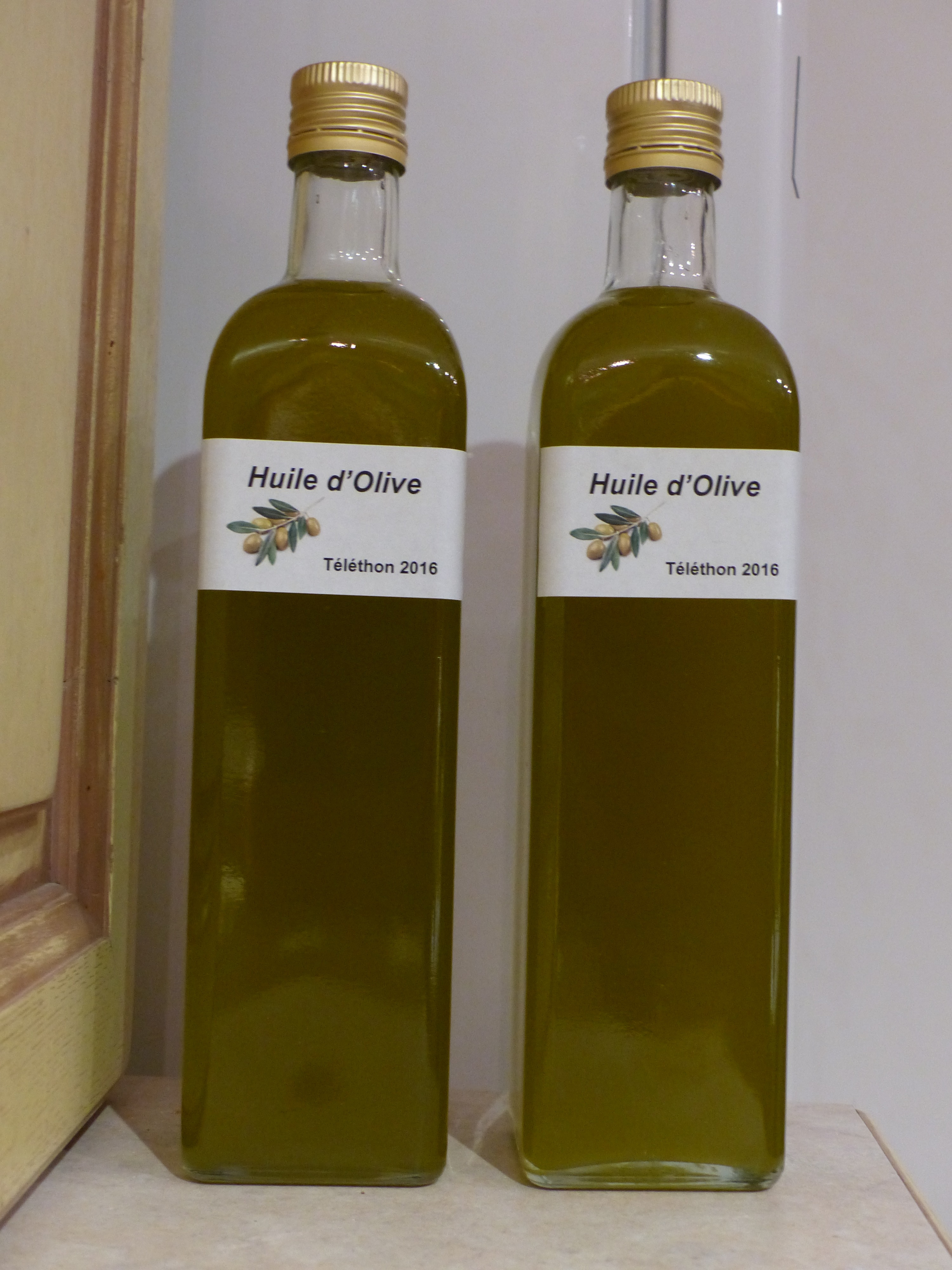 L’huile sera vendue en bouteilles au bénéfice du TELETHON 2017 du village… 100 % du prix de vente de la bouteille seront reversés au TELETHON ! (cueillette par des bénévoles, mouture et bouteilles offertes).