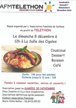 Vous pouvez dès à présent réserver votre dimanche 8 décembre. Parmi les nombreuses animations proposées ce jour là, à 12h00, salle des Cigales, l’association familiale, fidèle au Téléthon, propose un repas autour d’un coucous.