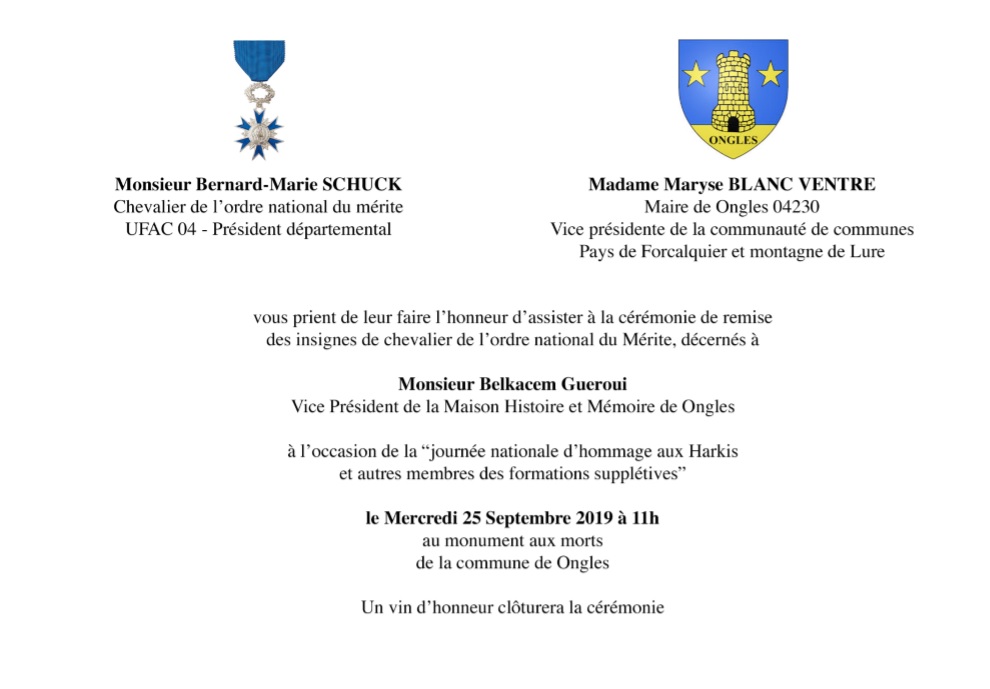 Dans le cadre de la cérémonie de remise des insignes de chevalier de l’ordre national du mérite à monsieur Belkacem Gueroui, il vous propose de vous joindre à lui mercredi 25 septembre, pour cette journée qui se déroulera à l’Ongles (Alpes de Haute Provence).