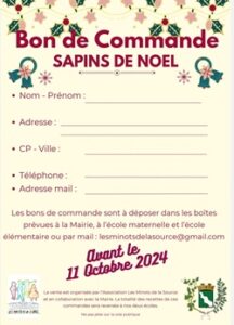 L’association Les Minots de la Source, en collaboration avec la mairie et les représentants des parents d’élèves, organise une vente de sapins de Noël dont les bénéfices seront ENTIEREMENT reversés aux deux écoles de Seillons. Cette initiative permettra de soutenir divers projets éducatifs pour les enfants, tels que des classes transplantées, des séances de piscine, des sorties scolaires, et bien d’autres encore.