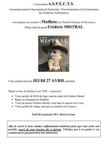 L’A.S.P.E.C.T.S (Association pour la Sauvegarde du Patrimoine, l’Environnement et la Connaissance des Traditions Seillonnaises) vous propose une journée à Maillane (au Nord de St Remy de Provence), village natal du grand Frédéric MISTRAL le :