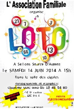 Samedi 14 Juin à 15h00, salle des cigales, venez gagner l’un des nombreux lots proposés lors de ce loto organisé par l’association familiale. Aucun doute… Vous allez faire un carton !!! 🙂