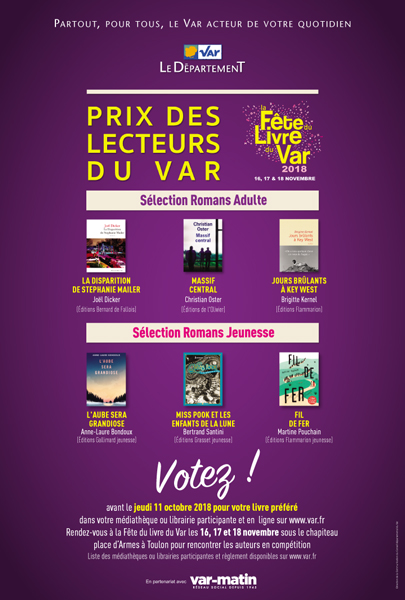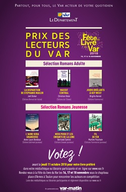Les 16, 17 et 18 novembre  2018 aura lieu la grande fête du livre du Var. Comme chaque année, depuis 1997 (lors de la première édition de « livres en toute liberté »), la Médiathèque Départementale du Var propose aux lecteurs du département d’attribuer à un auteur le prix des lecteurs du Var (l’un des rares prix littéraire en France décerné par les lecteurs eux-mêmes). Ce prix a pour objectif la découverte d’auteurs mais également d’ouvrages reconnus par la critique.